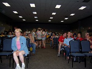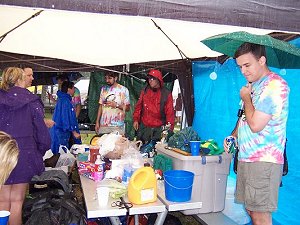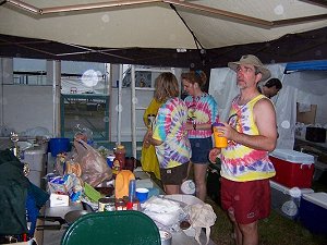 It started getting dark around 8:45, and the rain came about 10 minutes later. It rained so hard that the water was coming in through the tops of the canvas tents, so that it rained underneath. That forced everyone inside, and fortunately the ballroom was hosting the trivia game at the time, so we had the biggest crowd ever to watch space trivia. (OK, we came in second, but we almost won.)