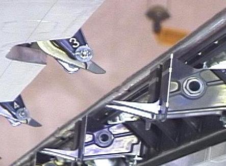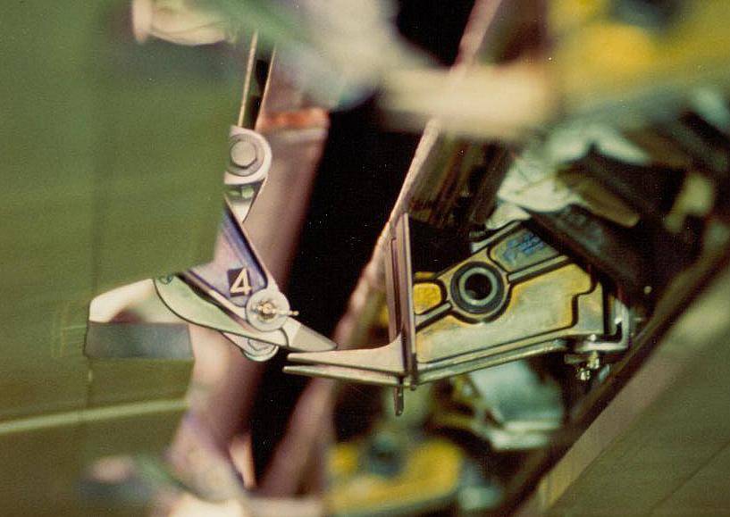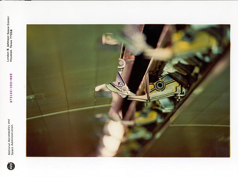 Not every striker plate, however, has the stripes; on OV-105, for example, stripes are visible only for latches 3, 5, 7, 9, 11, 13, 15, and 16. Striker plates for latches 3 and 4 are shown below.