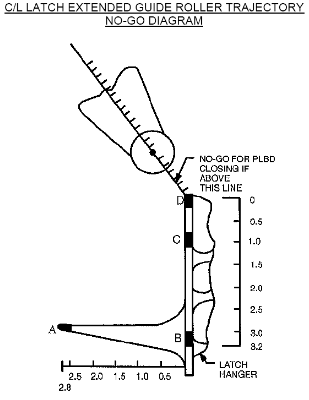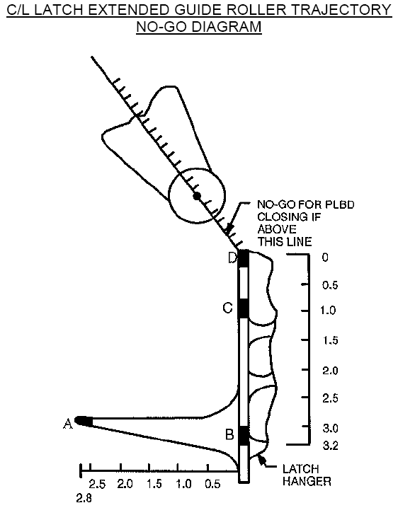The Centerline Latch Extended Guide Roller Trajectory diagram is used when closing the starboard door only. The crew will check the trajectory of the extended guide roller (the long thin part with a wheel at the end) as it moves towards the port door and the striker plate and latch hanger mounted on the door. When the PLB Door switch is taken to Stop, there may be up to one second of motion afterwards, and the door will "bounce" once or twice before stopping all motion. It is on the first bounce that the crew should monitor where the extended guide roller is aiming, as this will be the farthest point in the door's motion before it damps out. The roller usually will tend to be aiming for the lower part of the hanger, between points A and B, but as long as the roller will be below point D, then the doors will close properly. If the roller looks like it will be above point D, the crew is No-Go to continue closing the doors; the concern is that there will be an overlap of the doors and they will not seal properly. If the crew is No-Go to continue, MCC will direct a attitude to thermally condition the payload bay doors in preparation for another attempt later. The numbers on the diagram represent the diameter of the roller wheel, used for reference.