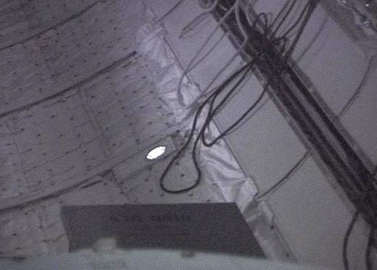 These photos from OV-105 (in OPF-1, 3/13/00, via window W9) show the port mid flood light in close-up and normal view. The lighting is artificially enhanced by a small portable fluorescent light on a table in the payload bay, as seen in the long view.