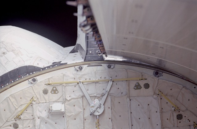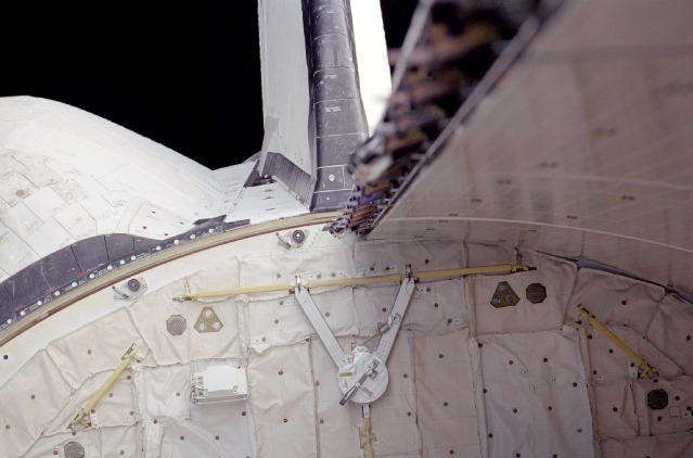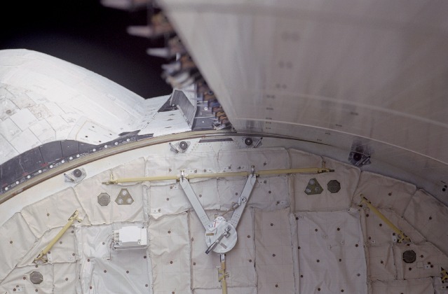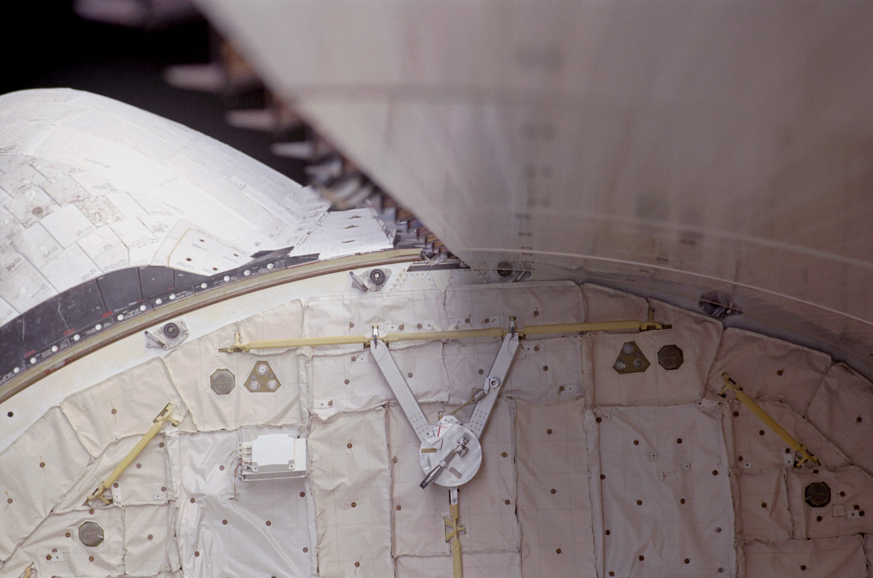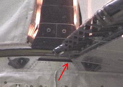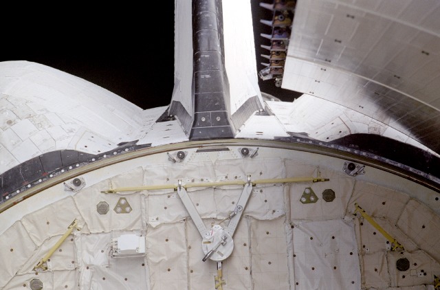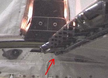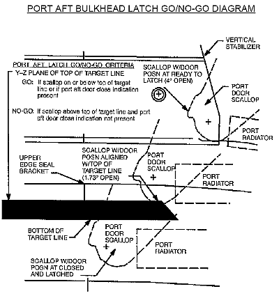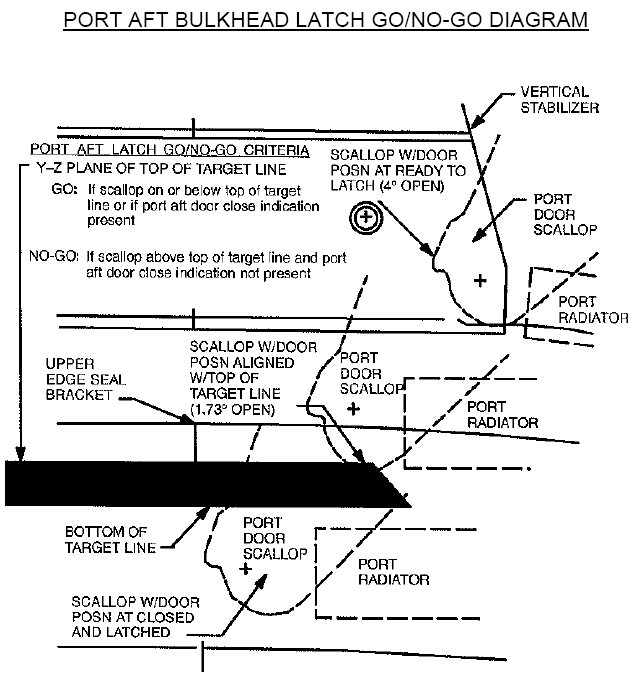 The Port Aft Bulkhead Latch Go/No-Go Diagram is used for the door closing case in which the Port door is stuck in the Ready-to-Latch position (RDY) for > 6 seconds and does not go to CL on the display. The RDY position means that the door is within 4° of being fully closed, and at that position the bulkhead latches can grab the door and "zipper" it closed from the bottom up, assuming the door has not been thermally warped. If the scallop (the rounded part that hangs down from the corner of the door at the bulkhead) is on or below the top of the target line (the black stripe located on the aft bulkhead below the vertical stabilizer), then the crew is Go to continue. If the scallop is above the top of the target line, then the crew is No-Go to continue. Even though the top of the target line represents the door being 1.73° open -- within the 4° envelope -- MCC would want to look at things before giving the final Go to proceed.