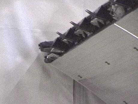 Except as noted, all photos are single frames from a digital video of the doors opening in the OPF, cropped and brightened. Orbiter is OV-105, in OPF-1 on 3/13/00, taken from the Flight Deck via Window W9.