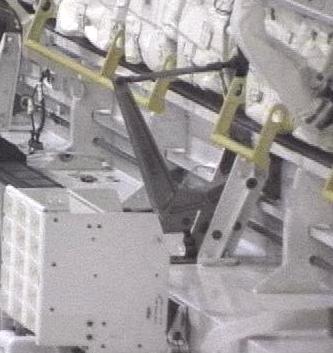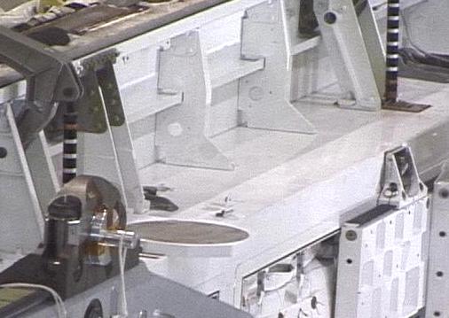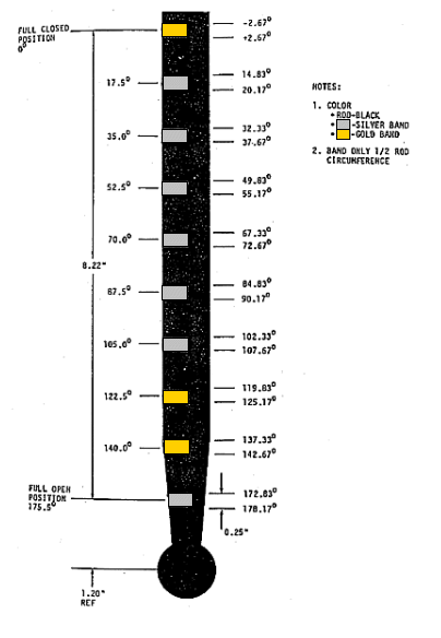 When the doors are opening, the pushrods display up to ten stripes, each 17.5° apart (from the top, the stripes are one gold, six silver, two gold, and one silver). Since there is limited telemetry on how open the doors are (0° = full closed, 175° = full open), the crew can assist MCC in determining if a door is opening or closing properly, or if it is jammed or warped, by calling down the number of stripes on the pushrods. Six of these pushrods are attached to the door torque tube and a bell crank, all of which open and close the doors.