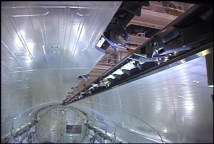 in OPF-1 on 3/13/00, taken from the Flight Deck via Window W9. Centerline latch #1