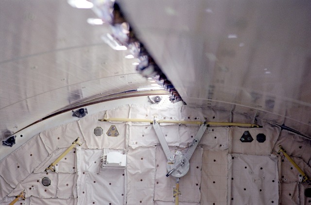 Video from STS-102 (OV-103, 3/21/01) via minicam installed in window W10. Not as useful to see the gap between doors, but shows the "bounce" after the door is stopped. On this mission, the crew stopped the door but the gap was too wide, so they bumped the door closed a bit a second time. |